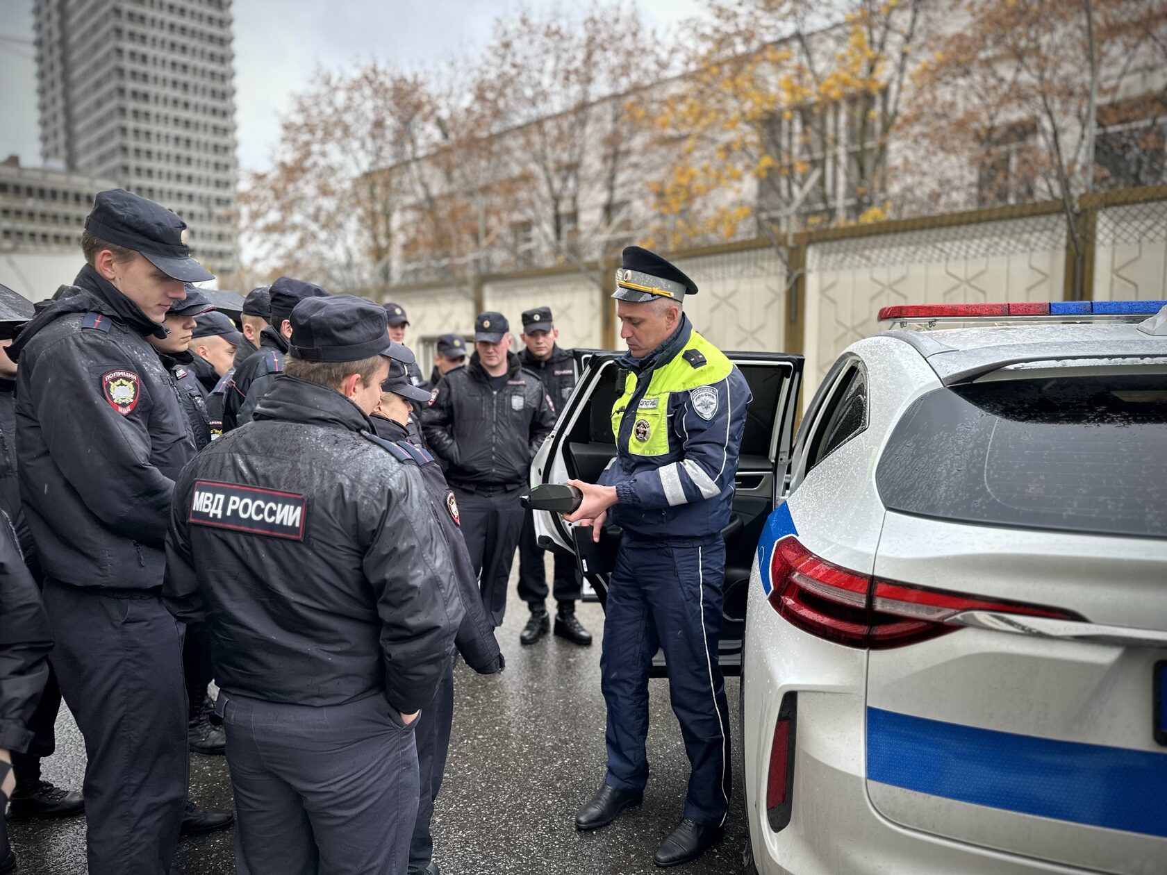 Сотрудники Госавтоинспекции представили гостям служебный автомобиль, оснащенный современным оборудованием и познакомили с принципами работы тауметра, алкотестера и жезла регулировщика.